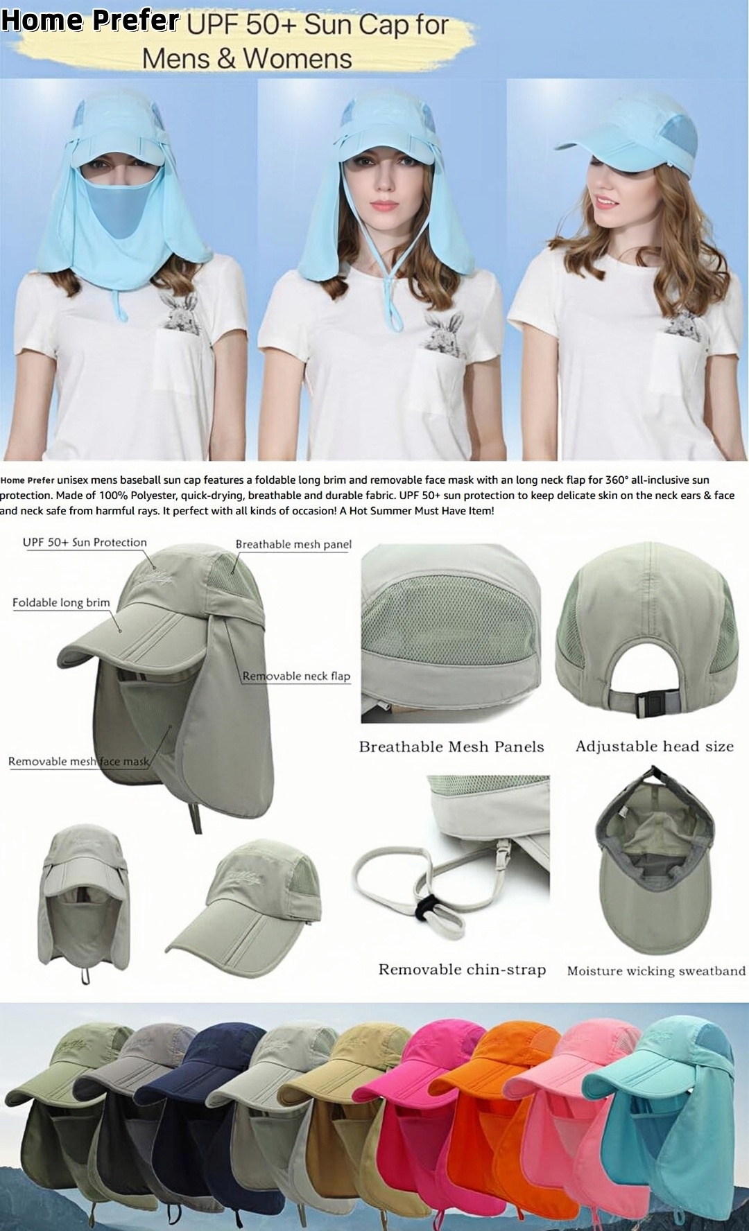 Home Prefer Men's Foldable Outdoor Sun Cap with Removable Face Mask Neck Flap Cover UPF 50+ Sun Protection Fishing Hiking Hat